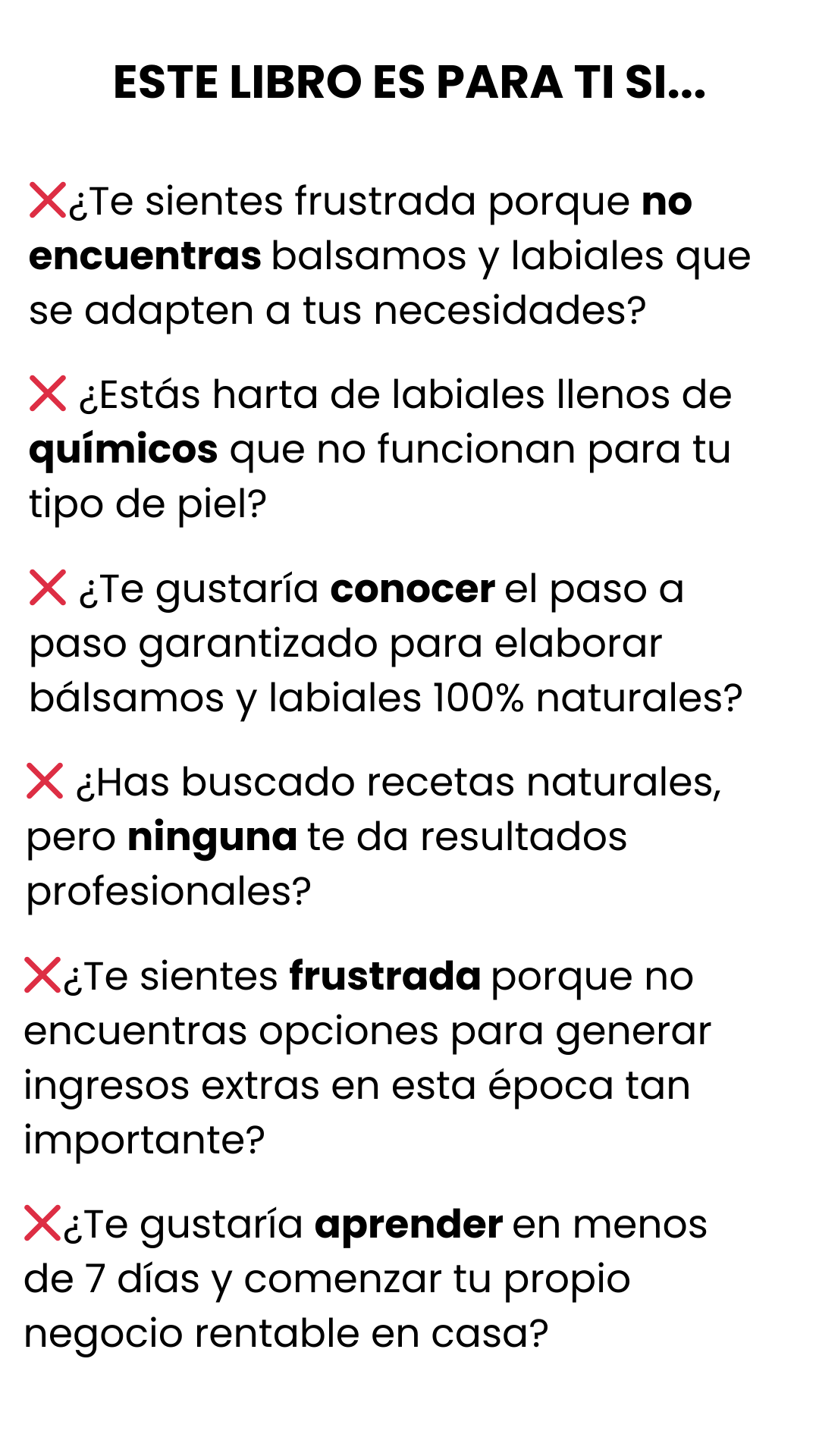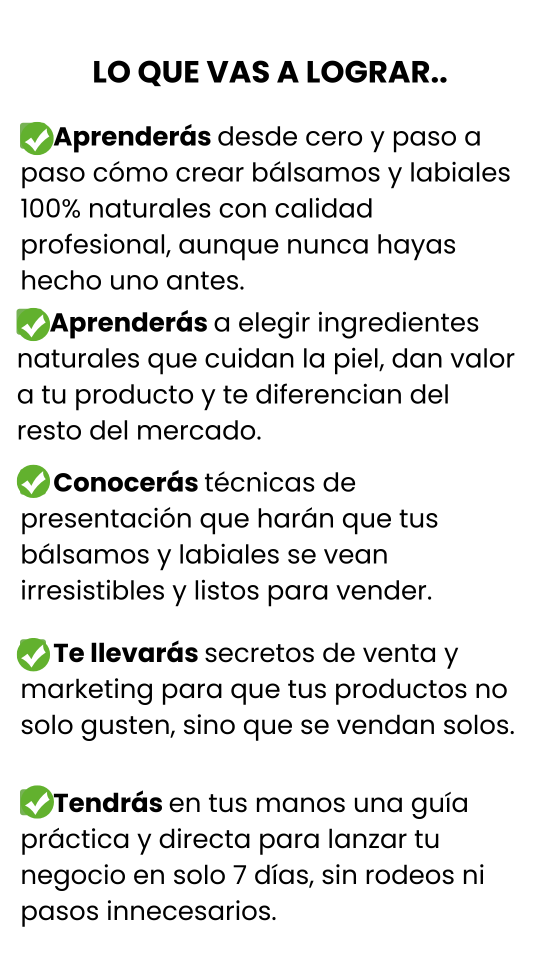 Al realizar tu compra, recibirás de inmediato un correo electrónico con el libro digital "BÁLSAMOS Y LABIALES PARA EMPRENDER" 📘 + 6 Bonos adicionales completamente GRATIS 🎁.